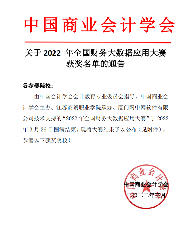 3月26号,由中国会计学会主办的“2022年全国财务大数据应用大赛”圆满落幕。公司永利yl23411官网方晨宇、何涛、袁诗瑶、余锡龙组成的代表队从全国92支代表队脱颖而出,以总分第八夺得一等奖!